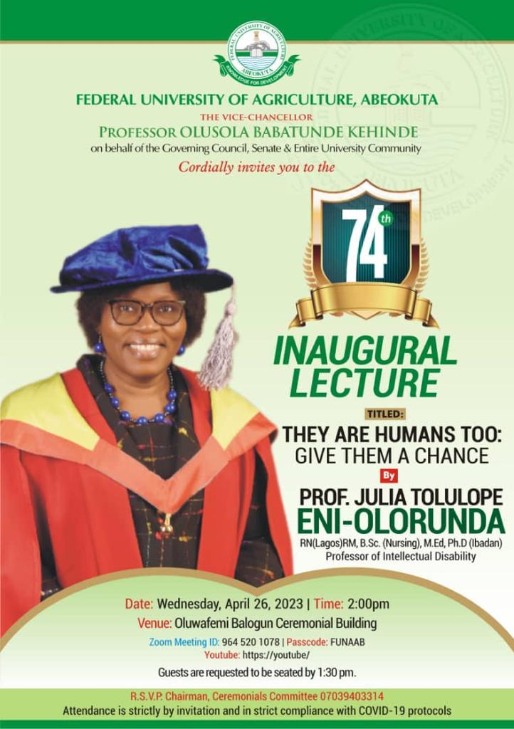 The lot of people with disability have been brought into focus at an academic community lecture where parents and the society at large have been urged to love and understand that Children of suchlike, are human beings who have no control over their disability. A Professor of Intellectual Disability, Professor Tolulope Eni-Olorunda who made the plea said their acceptance by Parents and the Society would help them to adjust emotionally, psychologically and socially, as well as, help them to live independent lives. Professor Eni-Olorunda was speaking while presenting the 74th inaugural Lecture of the Federal University of Agriculture, Abeokuta at the institution’s Oluwafemi Balogun Ceremonial Hall on Wednesday, 26th April, 2023. She also called on the Nigerian government to ensure that the Disability Bill passed into law by President Mohammed Buhari in 2019 should be implemented accordingly so that Children with intellectual disability could have enabling environment to live independently and enjoy their rights to education. The inaugural Lecturer who disclosed that there are over 27 million persons with disabilities in Nigeria stated that it was abnormal to refer to such people as ” physically challenged persons” , instead they should be referred to as ” persons with special needs” or “exceptional Children”. The Lecture titled: ” They Are Humans Too: Give Them A Chance”, would be the first to be presented since the assumption of office of the seventh Vice- Chancellor of FUNAAB, Prof. Babatunde Kehinde in April, 2023. The occasion was a meeting ground for both the gown and the town, as eminent personalities from both sides were in attendance including Principal Officers of the Federal University of Agriculture, Abeokuta.